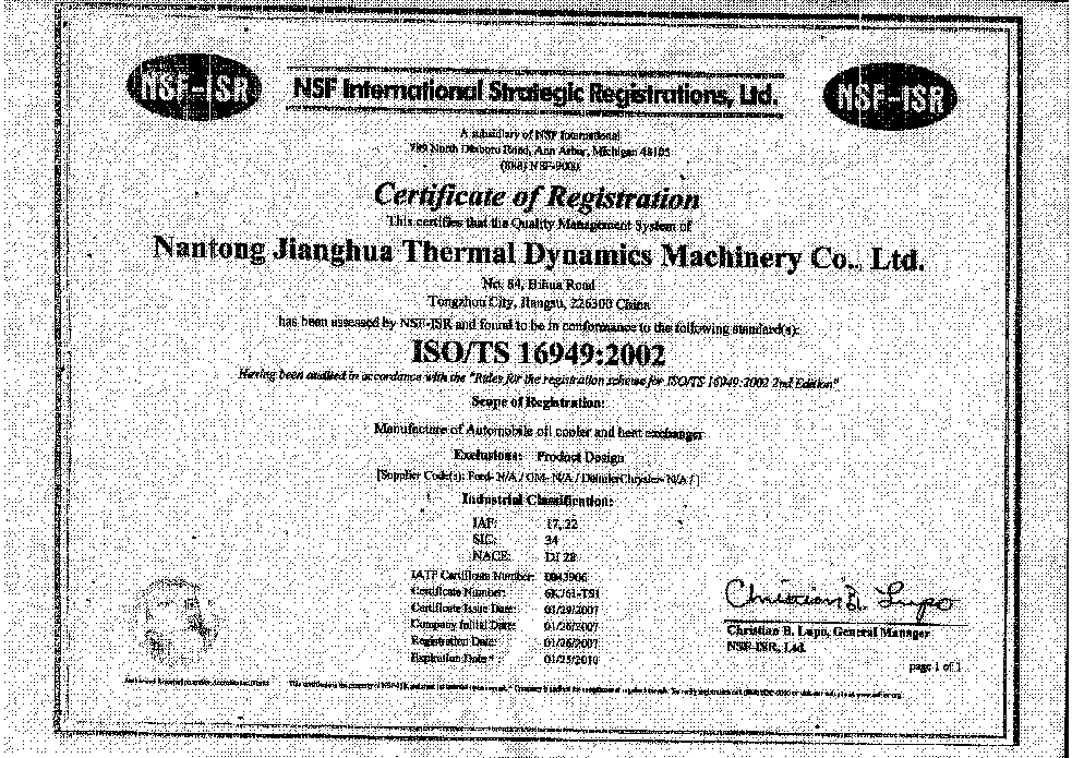 南通江华机械有限公司建于1956年,附有两个分公司:1. 南通福乐达汽车配件有限公司 2. 南通江华热动力机械有限公司。主要为全球著名汽车总装厂如:福特,通用,克莱斯勒,法雷奥,伟世通,MARK IV做配套。配套产品涉及汽车管片式油冷却器,汽车涨紧轮,汽车用管件及冲压件等。管片式油冷却器已于2002年通过ISO/TS16949质量体系认证,汽车皮带轮已于2006年通过ISO/TS16949质量体系认证。南通江华有限公司真诚希望能与全球其他汽车总装厂合作,做强、做大配套产业。